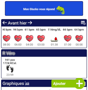 Les informations et résultats de vos enfants apparaissent simplement en dessous de vos relevés, vous y retrouverez : glycémies, nombre de pas, fréquence cardiaque...