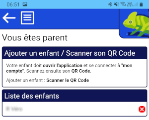 Le menu "Mes Enfants" devient disponible et affichera la liste de vos enfants, vous pourrez ainsi ajouter vos enfants en scannant leur QR Code.